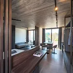 Experimenta el máximo confort en la cocina del Golden Sun Luxury Apartment Adults Only, equipada con hervidor eléctrico, nevera y también horno.